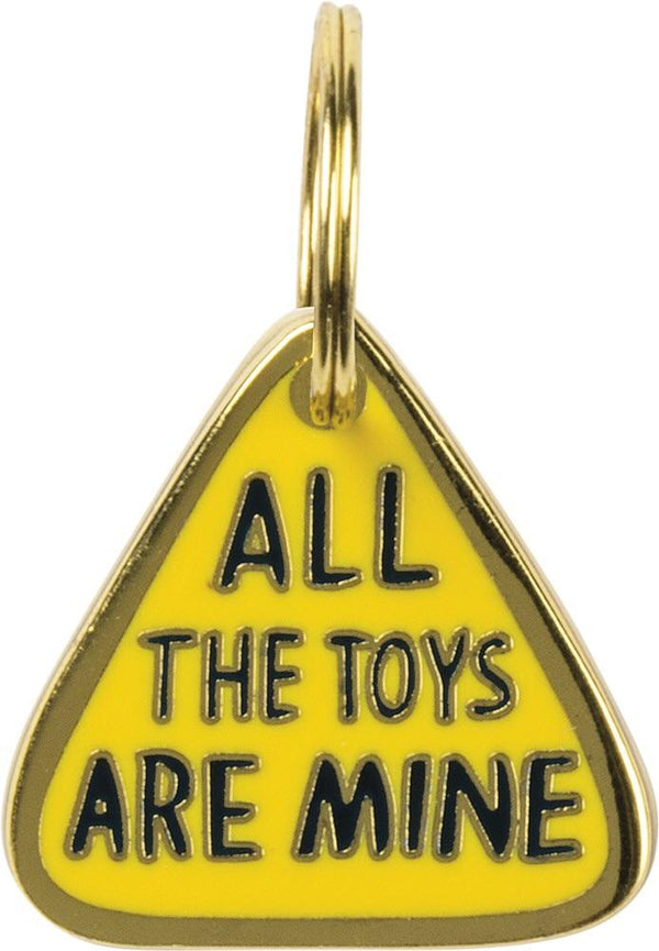 A high-quality, hard enamel collar charm featuring an "All The Toys Are Mine" sentiment with an original, hand-illustrated design to add playful personality! Charm is attached to an illustrated cat backer card in plastic bag for easy hanging. Back of charm is safe to be engraved without damaging front enamel.