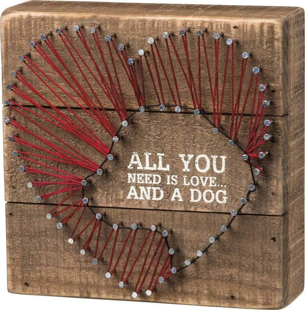 A slat wood box sign featuring a hand-strung heart design with dog silhouette accent and "All You Need Is Love And A Dog" sentiment. Easy to hang or can free-stand alone. This box sign is the perfect gift for the dog lover in your life.